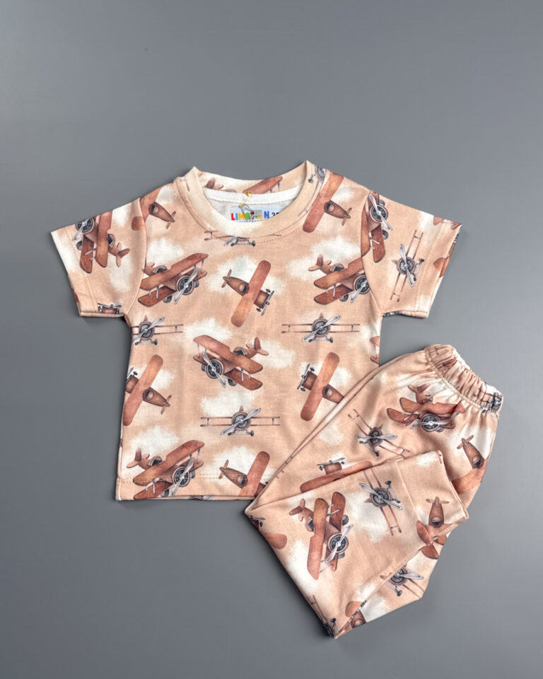 ست خانگی تیشرت و شلور لیموتین طرح هواپیما قهوه ای